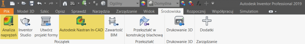 Poniżej widok zakładki Środowiska na wstążce programu Autodesk Inventor Professional 2019 gdy jest zainstalowany Nastran In-CAD.