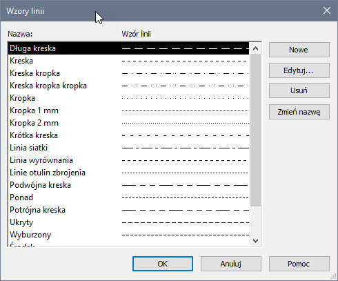 Zanim przejdę do głównego tematu bloga, dla uzyskania nieco szerszej perspektywy zajrzę do okna dialogowego, w którym program Revit pozwala definiować własne wzory linii, co pozwoli zrozumieć, czemu używam opisanych niżej narzędzi.