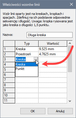 Edycja wzorów linii jest możliwa po kliknięciu Edytuj… , natomiast definiowanie własnych wzorów po kliknięciu na przycisk Nowe.