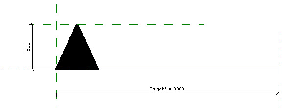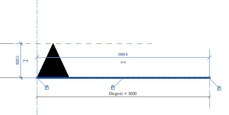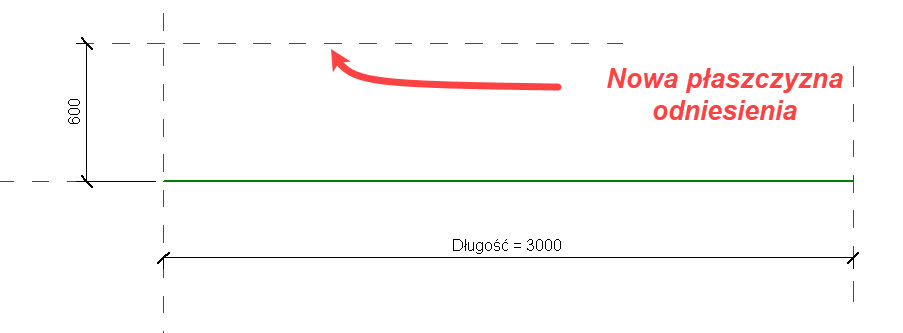 Zwiększam długość pomocniczej linii odniesienia do 3000mm (jest ona sparametryzowana) i dodaję poziomą linię odniesienia 600mm ponad linią istniejącą. Dodam od razu, że moglibyśmy także sparametryzować wysokość oznaczenia, jednak nieco skomplikowałoby to dalsze kroki tego przykładu (musielibyśmy odpowiednio związać obiekty, aby rozciągały się elastycznie. Załóżmy dla uproszczenia, że nie jest to nam teraz potrzebne.