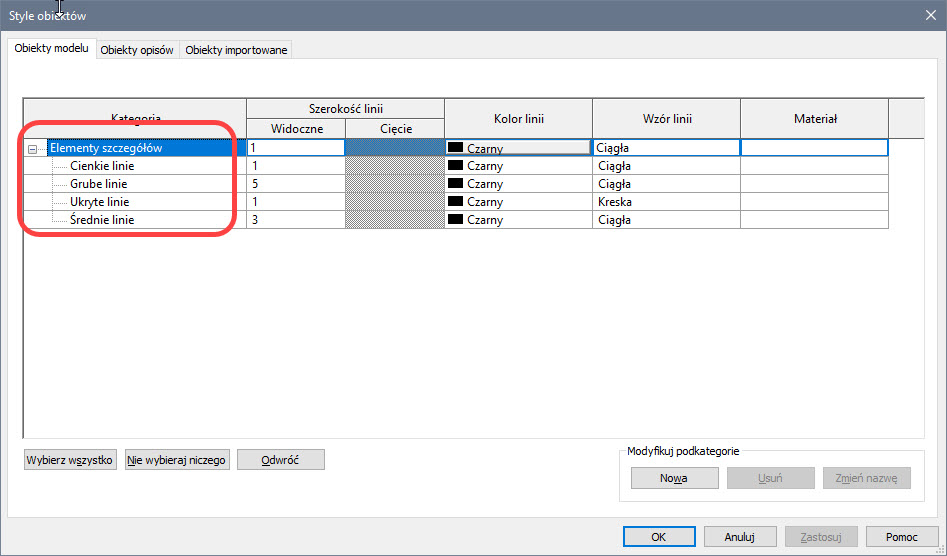 Aby uzyskać możliwość sterowania grubością linii przyszłego oznaczenia, w rodzinie, w oknie Style obiektów, upewniam się, że mam dostępne linie o różnych grubościach, których nazwy są zgodne z używanym przeze mnie szablonem projektu Revit.