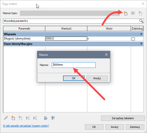 Zdefiniuję jeden typ komponentu, dla długości 3000mm. W tym celu włączam okienko   (Typy rodzin). Klikam Nowy typ i nadaję nazwę 3000mm.