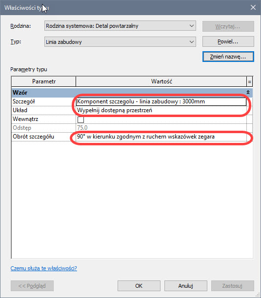 Przyciskiem Powiel tworzę nową definicję rodziny o nazwie Linia zabudowy.
