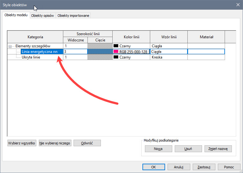 Aby uzyskać różne kolory, w rodzinie można zdefiniować specjalne podkategorie linii, jak niżej pokazuję dla komponentu szczegółu linii energetycznych niskiego napięcia.