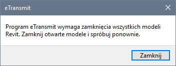 (Pokaż model(e)) podczas pracy z projektem, zobaczymy komunikat z informacją, iż należy przed uruchomieniem zadania zamknąć wszystkie dokumenty w Revit.