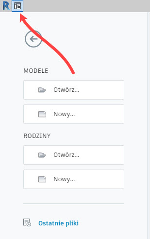 Po zamknięciu wszelkich projektów program pokazuje nam zawartość tzw. strony głównej Revit, a w wersji Autodesk Revit 2019.1 nie widać nawet wstążki. Włączam widoczność wstążki albo poprzez kliknięcie w lewym górnym rogu na Narzędzia główne, alternatywnie używam skrót <Ctrl>+<D>.