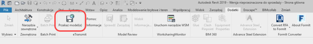 Znajdziemy je w menu wstążkowym, w zakładce Dodatki na panelu eTransmit, pod nazwą Przekaż model(e).