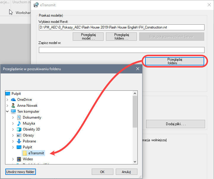 W obszarze Zapisz model w za pomocą przycisku Przeglądaj foldery… wskazuję folder docelowy – przykładowo tworzę nowy folder na pulpicie o nazwie eTransmit.