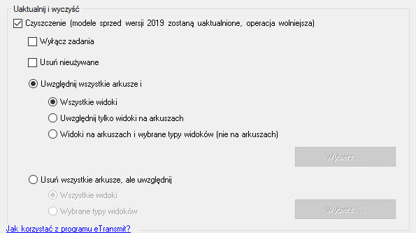 W obszarze Uaktualnij i wyczyść znajdują się dodatkowe narzędzia – są dostępne po zaznaczeniu opcji Czyszczenie (modele sprzed wersji 2019 zostaną uaktualnione, operacja wolniejsza). Użycie narzędzi ma sens, jeśli potrzebujemy przeczyścić zawartość pod kątem potrzeb potencjalnego odbiorcy i/lub jeśli wśród modeli znajdują się modele starsze niż w obecnej wersji Revit.
