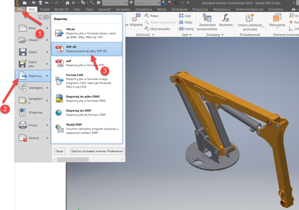 W menu głównym programu Plik należy przejść do kategorii Eksportuj… a następnie w tej kategorii wybrać polecenie PDF 3D.