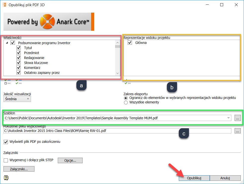 W nowo otwartym oknie Opublikuj plik PDF 3D można zaznaczyć jakie właściwości (a) z iPropertis pliku IPT lub IAM zostaną przeniesione do pliku PDF (przeniesienie właściwości jest zależne od wykorzystanego szablonu (c)). W obszarze Reprezentacje widoku projektu (b) można wskazać do przeniesienia na PDF zapisane wcześniej widoki z plików Inventora. W polu Szablon (c) należy wybrać odpowiedni szablon do wygenerowania pliku PDF 3D. Firma Autodesk dostarcza cztery przykładowe szablony: