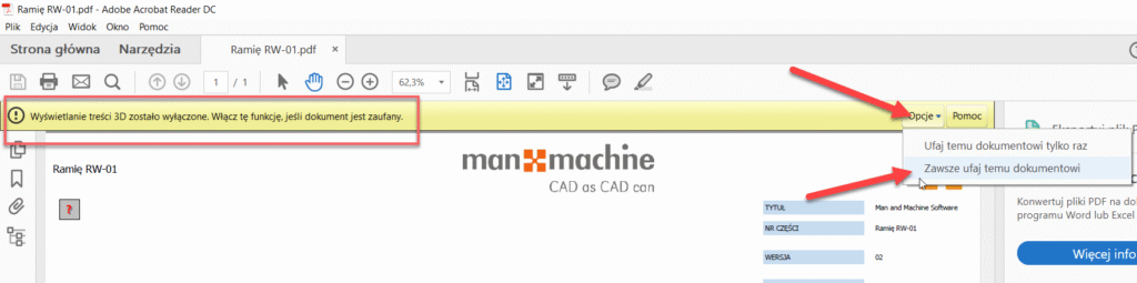 Po chwili zostanie wygenerowany plik PDF który należy otworzyć za pomocą przeglądarki Adobe Acrobat Reader aby cieszyć się pełnią funkcjonalności powstałego dokumentu. Ze względu na bezpieczeństwo wyświetlanie treści 3D może być domyślnie zablokowane i konieczne będzie wybranie opcji Zawsze ufaj temu dokumentowi.