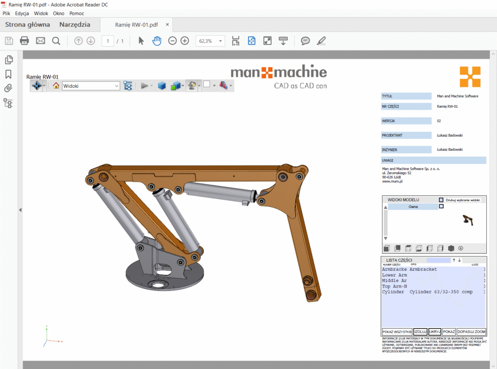 Poniżej widok pliku PDF 3D, który powstał na podstawie zmodyfikowanego przez mnie szablonu Sample Assembly Template.