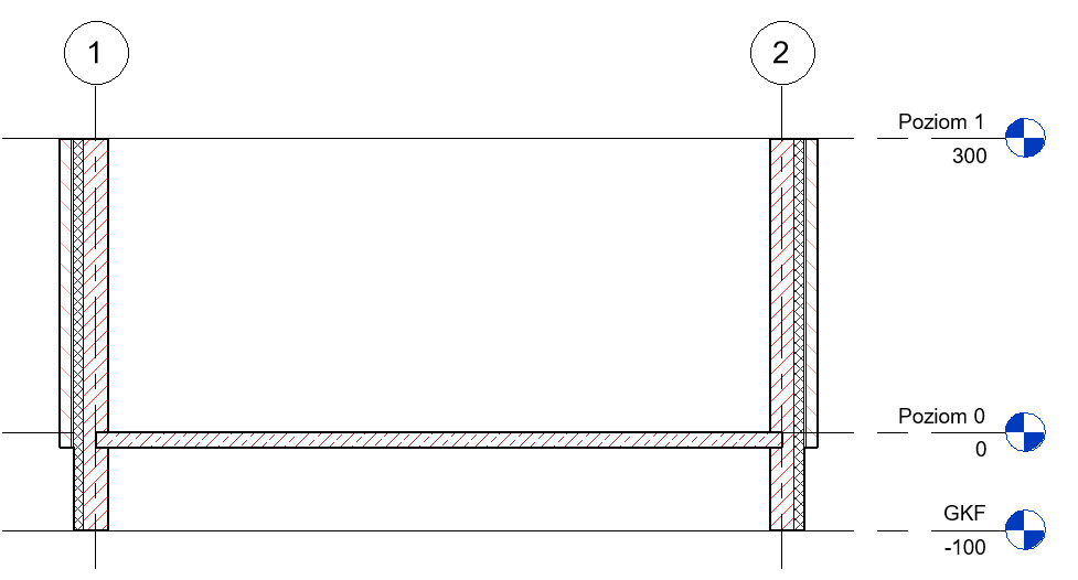 Na poniższym przykładzie poziom (pokazany strzałką) nazwałam GKF (Górny Poziom Fundamentu). Ściany konstrukcyjne fundamentowe zaczynają się na poziomie GKF i kończą na poziomie Poziom 0.
