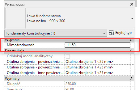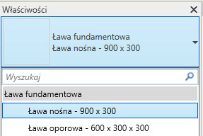 W moim przypadku chcę otrzymać ławę symetryczną względem fundamentowej ściany konstrukcyjnej. Poprzez Edytuj Typ powielam typ Ława nośna 900 x 300 i tworzę typ Ława nośna 600 x 300. Wskazanie ścian powoduje umieszczenie ław wzdłuż krawędzi.