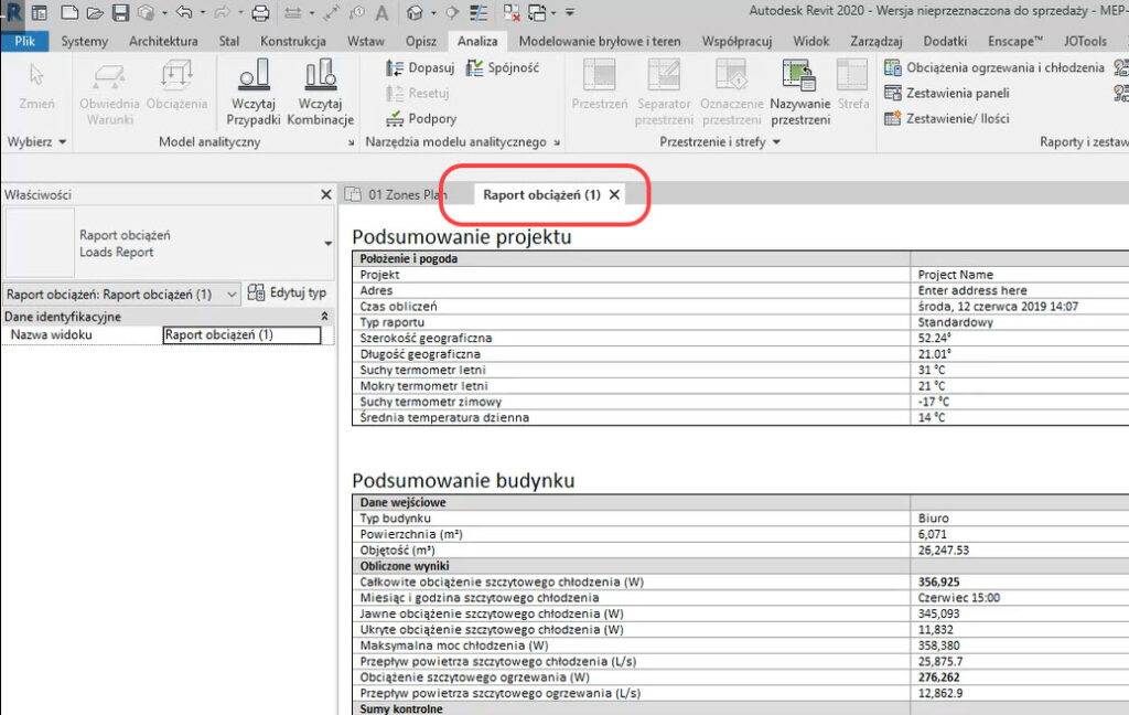 Program Autodesk Revit w wyniku pracy z narzędziami do obliczeń obciążeń generuje końcowy raport, zawierający podsumowanie danych projektu, wyników budynku, wyników dla stref i dla poszczególnych przestrzeni. Raport ten, jak i inne widoki, umieszczany jest przez program w Przeglądarce projektu, stamtąd też można go w dowolnej chwili otworzyć w celu wyświetlenia w projekcie.