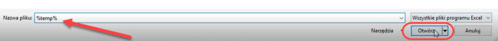 Kiedy program prosi o wskazanie lokalizacji arkusza na dysku, w okienku Nazwa pliku wpisujemy %temp% a następnie klikamy przycisk Otwórz.
