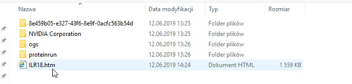Wchodzimy do folderu. Zawiera on, poza innymi plikami i folderami tymczasowymi plik o rozszerzeniu .htm, jak niżej. Wskazujemy go i klikamy Otwórz.
