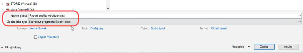 Raport można edytować, jak również oczywiście zapisać pod nową nazwą w innej lokalizacji, już w formacie Skoroszyt programu Excel (*.xlsx).