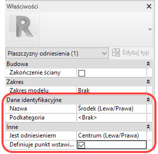 Wybranie Nie jest odniesieniem sprawi, że płaszczyzna będzie „niewidoczna” dla wymiarowania w projekcie, nie będzie generować wymiarów tymczasowych, nie będzie dostępna podczas wyrównywania ani widoczna dla jakiegokolwiek przyciągania w projekcie (np. osiowe płaszczyzny odniesienia nóg stołu, potrzebne do konstrukcji rodziny ale niepotrzebna podczas pracy w projekcie).