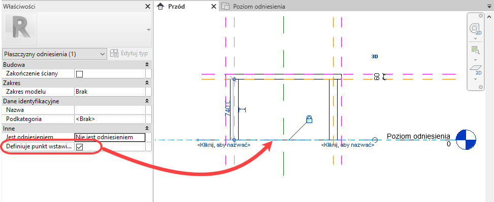 W szablonie Meble (metryczne).rft dwie płaszczyzny na rzucie są silnymi odniesieniami i definiują punkt wstawienia, natomiast w widoku elewacji płaszczyzna, pokrywająca się z obiektem Poziom, nie jest odniesieniem, ale definiuje punkt wstawienia.