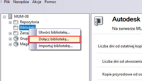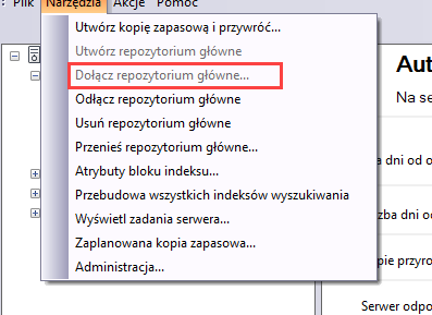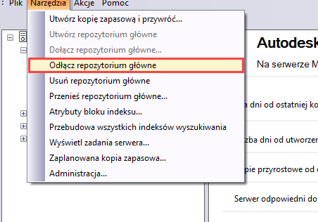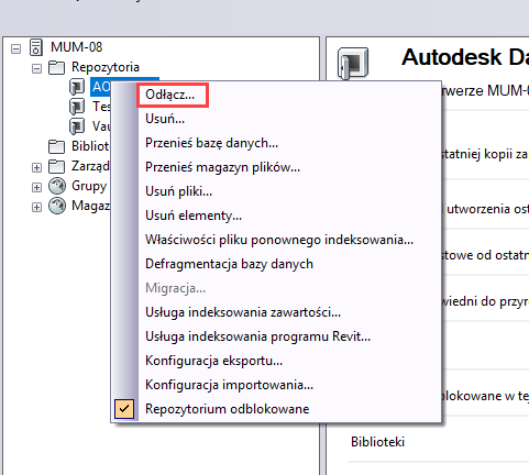 W konsoli serwera Vault odłącz repozytorium, biblioteki Content Center oraz  bazę KnowledgeMasterVault, dokładnie w tej kolejności: