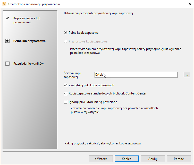 Zalety: metoda ta odbudowuje wszelkie niezbędne uprawnienia na serwerze SQL oraz przeprowadza migrację danych. Tworzy i weryfikuje kopię wszystkich baz, bibliotek oraz repozytoriów plików na danym serwerze Vault. Wszystkie dane zawarte są w jednym folderze wynikowym i tylko ten folder należy przenieść na inny serwer.