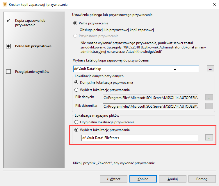 Przed rozpoczęciem pracy należy upewnić się, że w środowisku docelowym dysponujemy odpowiednią wersją serwera SQL – taką samą (wraz z aktualizacjami bądź wyższą od tej ze środowiska produkcyjnego. Vault może być przywrócony na jednym serwerze (SQL i repozytorium plików) bądź też na kilku (odpowiednie instrukcje na stronach Autodesk). Po zainstalowaniu serwera Vault nie należy jeszcze uruchamiać konsoli ADMS!