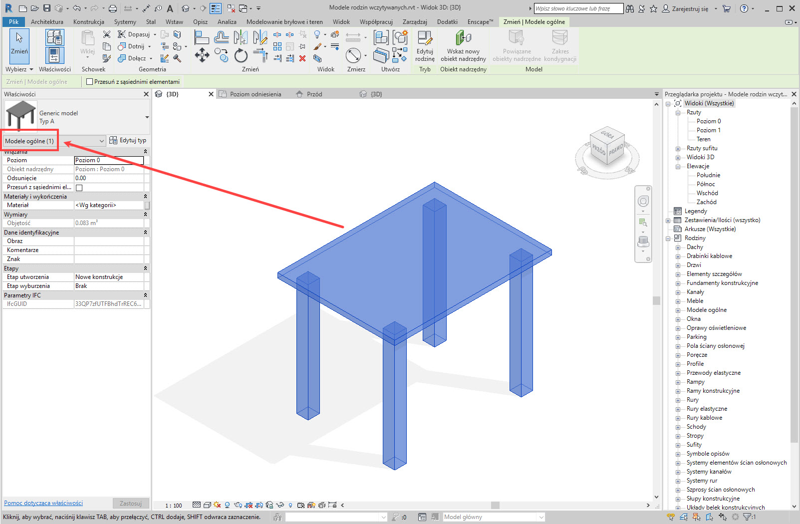 Revit pokazuje jej nadrzędną kategorię jako Modele ogólne. Wprawdzie w tej sytuacji typowego mebla zazwyczaj wystarcza zmiana kategorii w rodzinie na Meble, ale są takie przykłady rodzin, dla których albo nie ma w Revicie odpowiedniej kategorii, albo jej wybranie źle wpływa na zachowanie rodziny (dodatkowe, niechciane  parametry), albo też są inne powody, dla których chcemy zachować w Revicie przypisanie do modeli ogólnych i dopiero podczas eksportu do IFC ustawić docelową klasę.