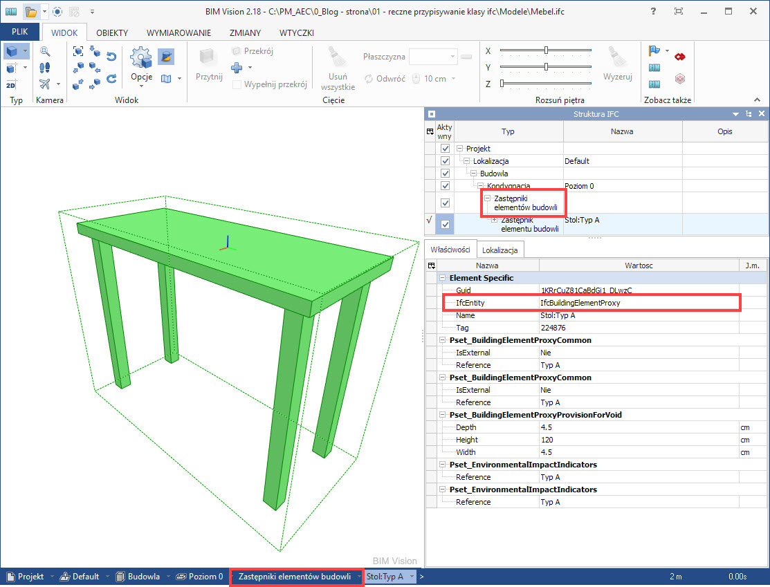 Projekt Revit eksportuję do formatu IFC (poniżej użyty IFC 2×3), a następnie otwieram w bezpłatnej przeglądarce IFC. Rodzina zostaje przypisana do klasy IfcBuildingElementProxy.