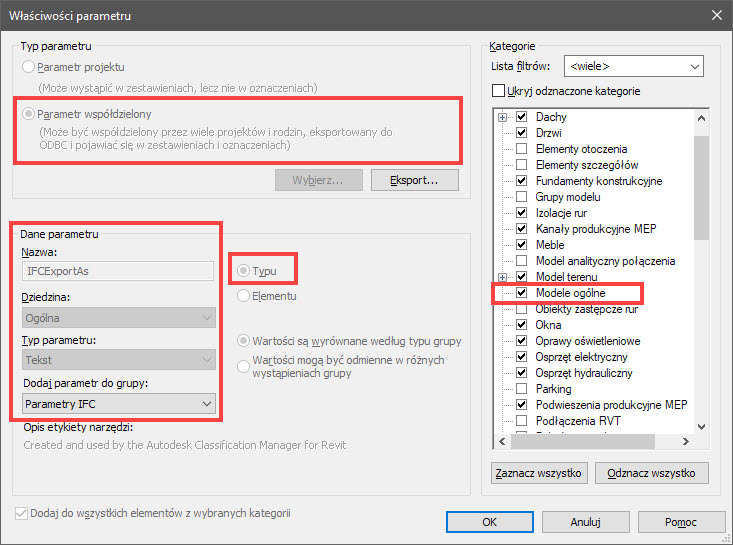Aby sterować przypisaniem głównej kategorii Revit do klas IFC, w projekcie musimy najpierw dodać tekstowy parametr współdzielony o nazwie IfcExportAs. Parametr możemy podłączyć z dołączonego do programu Revit pliku parametrów współdzielonych IFC o nazwie IFC Shared Parameters.txt. Dla wersji 2019 znajduje się on w lokalizacji C:Program FilesAutodeskRevit 2019.