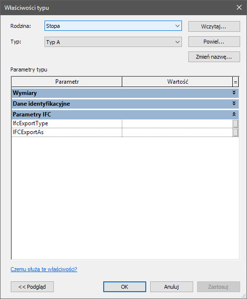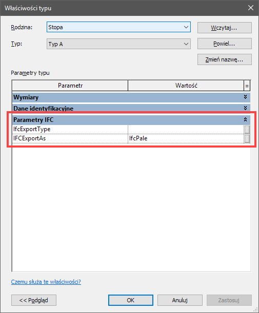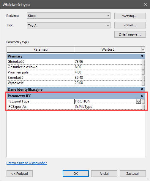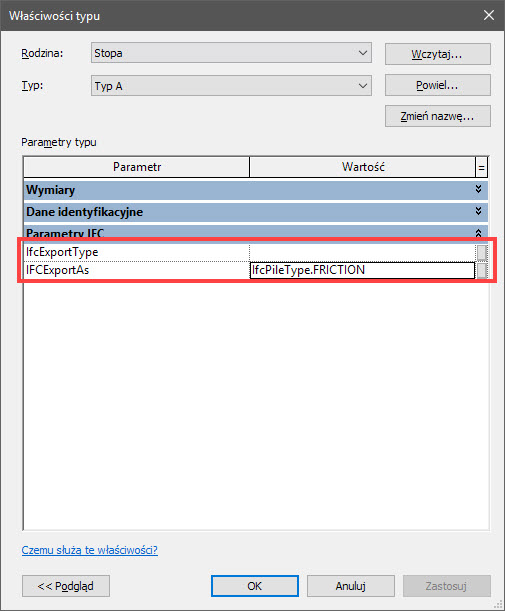 Pozwolę sobie na pewną dygresję na temat zasad stosowania powyższych parametrów współdzielonych. Przykładowo, chcemy, aby konkretna stopa fundamentowa była eksportowana do klasy pali o nazwie IfcPile i dodatkowo do typu IFC o nazwie FRICTION.