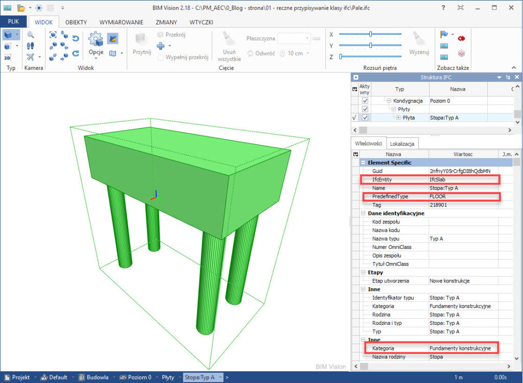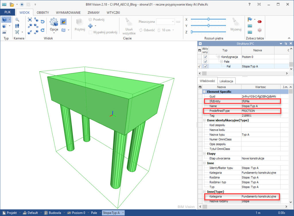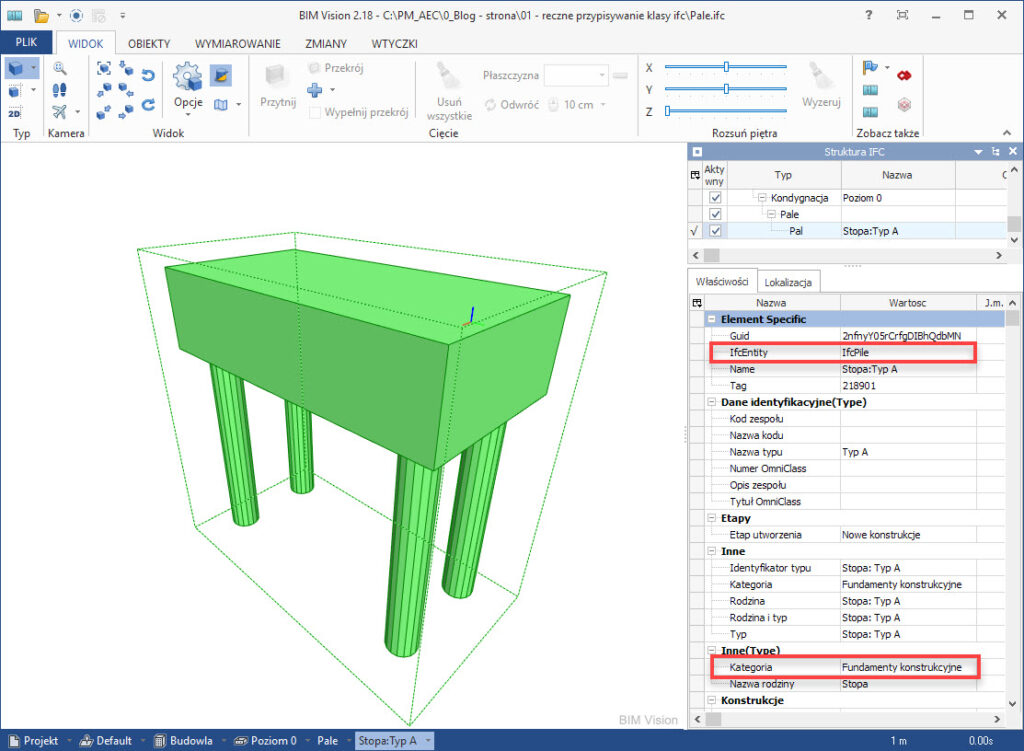 Po dodaniu klasy IfcPile (lub IfcPileType) przeglądarka pokazuje klasę IfcPile. Na dolnej listwie przeglądarki – Pale.