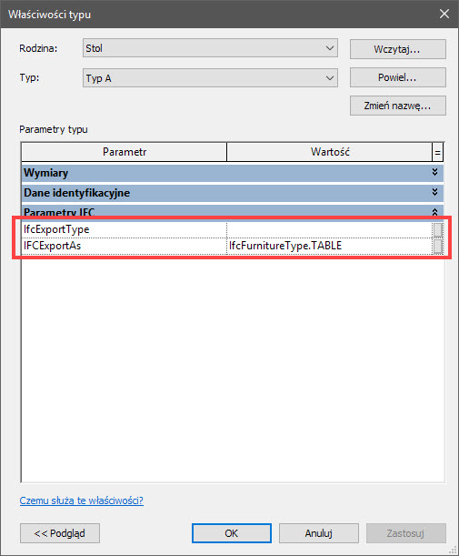 Bazując na przykładzie ze stopą fundamentową, po wskazaniu rodziny, za pomocą Edytuj Typ wpisuję dla parametru IfcExportAs wartość w postaci nazwy obsługiwanej przez Revit klasy IFC oraz po kropce typ (IfcFurnitureType.TABLE).