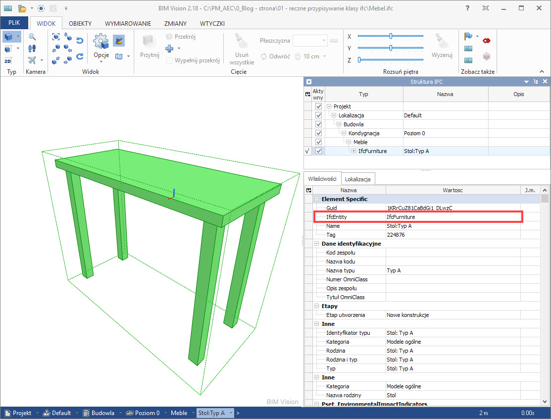 Po wyeksportowaniu nowego pliku IFC sprawdzam go w przeglądarce IFC. Obiekt jest już identyfikowany jako mebel, ale sukces jest połowiczny, gdyż typ IFC nie został zidentyfikowany – być może nie jest jeszcze obsługiwany przez moduł eksportu IFC 4.0 programu Revit. Na listwie przeglądarki widoczna jest kategoria Meble.