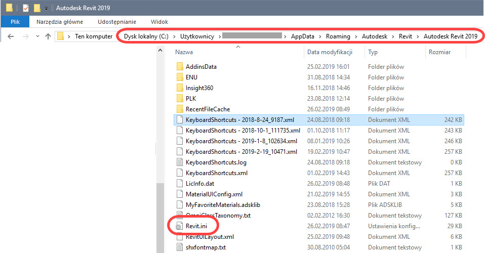 C:Użytkownicy<profil użytkownika>AppDataRoamingAutodeskRevitAutodesk Revit 2019Revit.ini