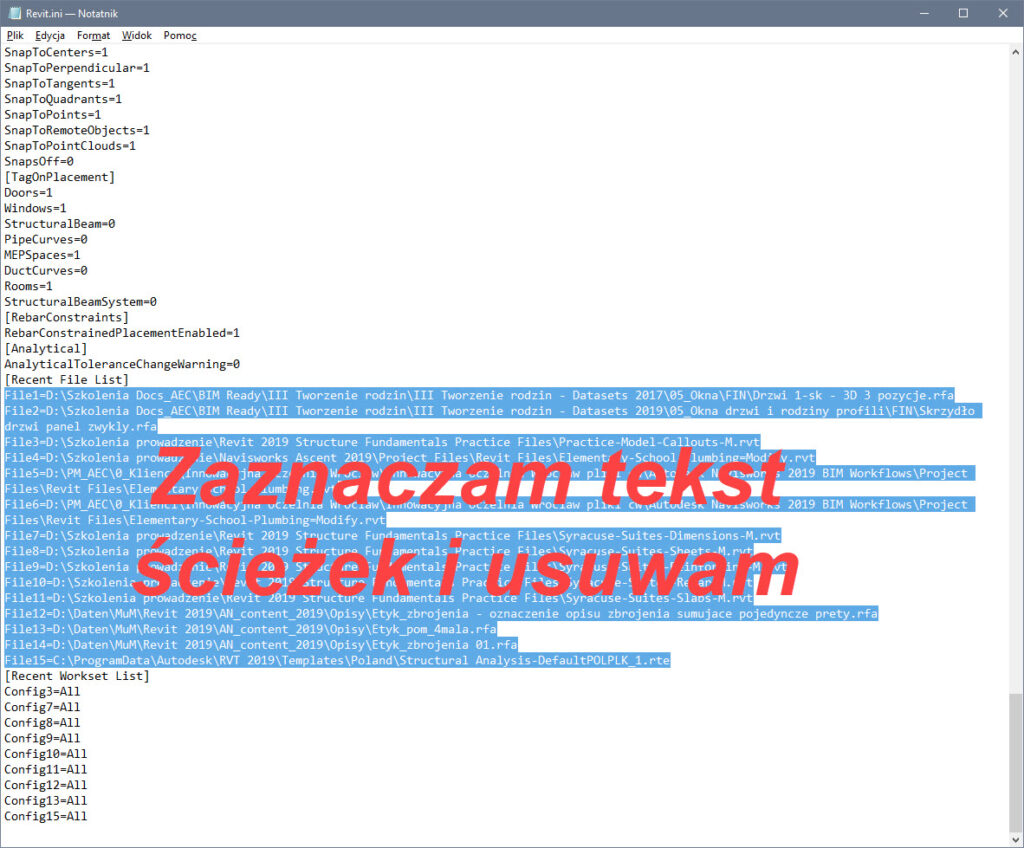 Upewniam się, że program Revit jest zamknięty, robię kopię zapasową pliku Revit.ini (ważne!) i otwieram plik Revit.ini za pomocą Notatnika Windows.