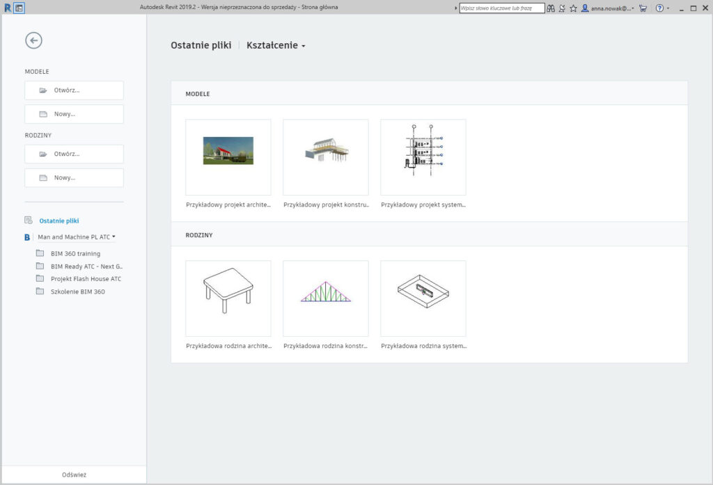 Zapisuję zmiany i uruchamiam program Revit. Panel startowy zawiera po trzy przykładowe projekty i rodziny, jak w świeżo zainstalowany programie.