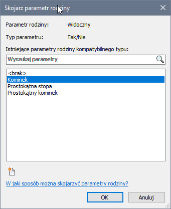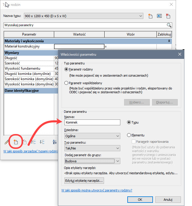 (Typy rodzin). Poleceniem Nowy parametr, które znajduje się u dołu okna tworzę parametr Typu, o nazwie Kominek, Typ parametru ustalam jako Tak/Nie, przypisuję go do grupy Budowa.