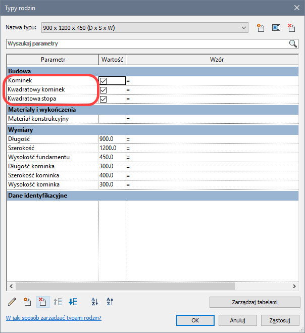 Poza opcją kominka dodam odpowiednie przełączniki dla kominka i dla stopy, aby automatycznie przybierały kształt kwadratowy. Później pokażę też w praktyce różnicę w działaniu rodziny opartej na parametrach typu i parametrach elementu.
