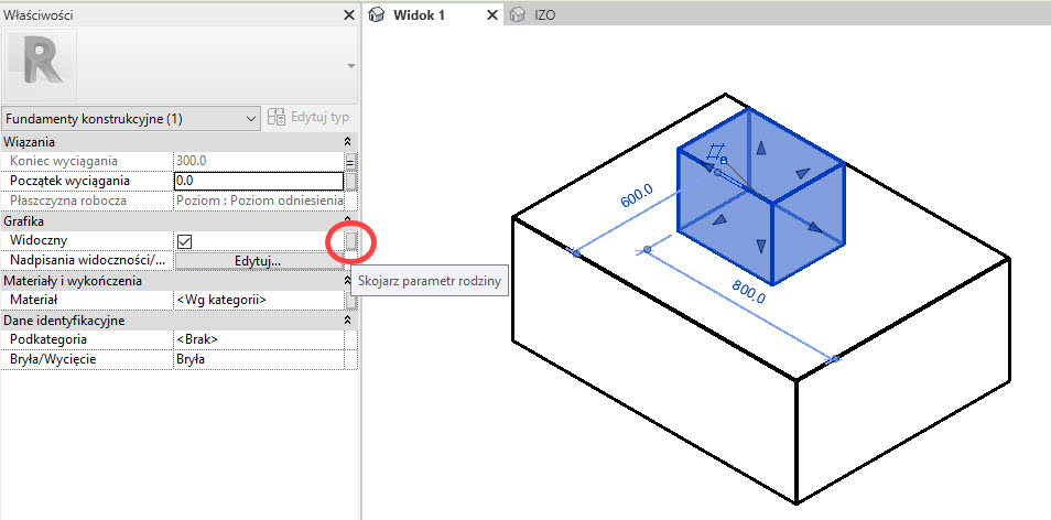 Wiąże się to jednak z ingerencją w typ wbudowanych parametrów rodziny Revit (parametry obecne w nowej rodzinie). Aby uniknąć konfliktu z innymi rodzinami stóp bezpieczniej jest utworzyć w rodzinie własne trzy parametry elementu np. z przedrostkiem W jak wystąpienie: W_Szerokość , W_Długość i W_Wysokość fundamentu, opierając na nich geometrię rodziny.