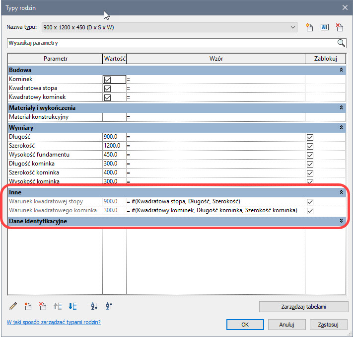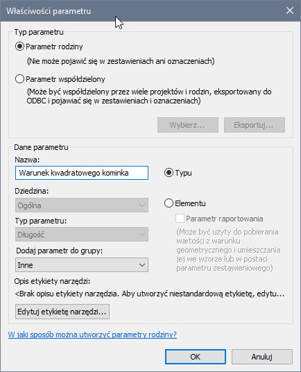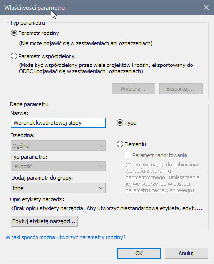 Dodaję nowy parametr Typu, o nazwie Warunek kwadratowej stopy, Typ parametru ustalam jako Długość, przypisuję go do grupy Inne. Dodaję kolejny parametr Typu, o nazwie Warunek kwadratowego kominka, Typ parametru ustalam jako Długość, przypisuję go do grupy Inne.