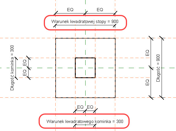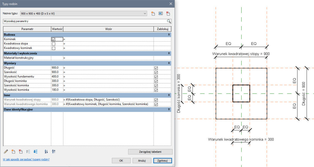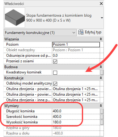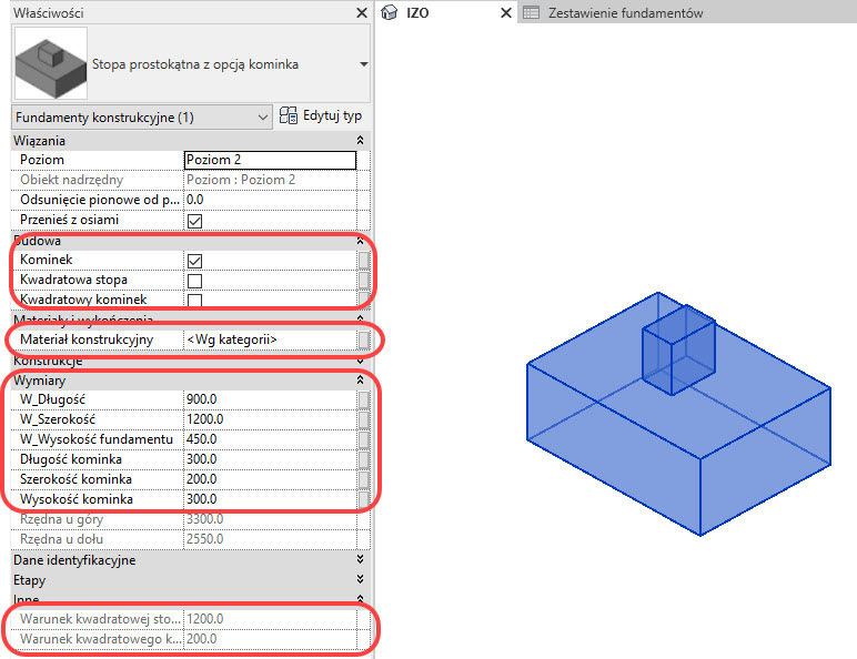 Poniższa stopa, wstawiona do projektu, jest całkowicie sterowana parametrami Elementu. Pozostawiłam w niej jeden typ: Stopa prostokątna z opcją kominka – wpisywanie rozmiaru w nazwę typu nie ma tu już sensu.