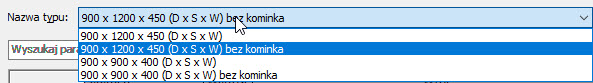 Klikam w górnej części okienka Nowy typ. Nadaję nazwę 900 x 1200 x 450 (D x S x W) bez kominka. Odhaczam przełącznik w wierszu Kominek.