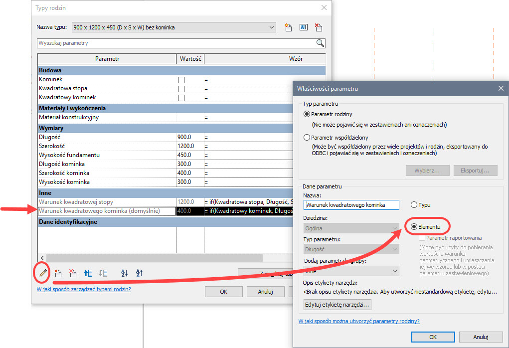 Wracam do Edytora rodzin. W oknie Typy rodzin klikam w wierszu parametru Warunek kwadratowego kominka z grupy Inne i za pomocą guzika Edytuj parametr przechodzę do okna Właściwości parametru, aby zaznaczyć Elementu zamiast Typu.