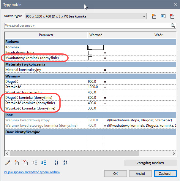 Zwracam uwagę, aby użyć dokładnych nazw trzech istniejących parametrów, włącznie z wielką/małą literą, w przeciwnym razie Revit nie przyjmie wyrażenia. W wierszu Warunek kwadratowego kominka, w kolumnie Wzór wpisuję: