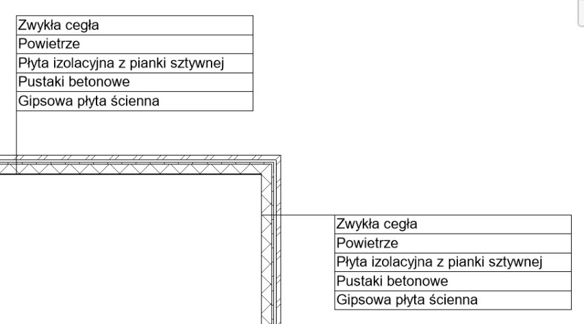 Poniższy film pokazuje jak, po niewielkim dostosowaniu etykiety, szybko przygotować oznaczenia przekrojonych obiektów wielowarstwowych, jak poniżej, na przykładzie ścian. Całą chorągiewkę raz przygotowaną można łatwo powielać w projekcie oraz przystosować do widoku po ewentualnej zmianie jego skali, co także pokazuję na zakończenie filmu.