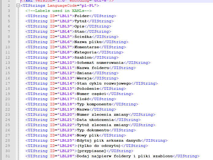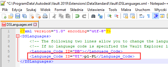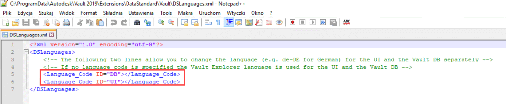 Powyżej widzimy określenie „na sztywno” w pliku konfiguracyjnym polskiej wersji językowej dla dodatku VDS (przydatne, jeżeli np. język klienta Vault jest inny niż polski).