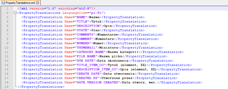 W pierwszym pliku widzimy, że dla każdej nazwy systemowej właściwości jest określone jej tłumaczenie, czyli nazwa wyświetlana w nagłówkach tabel, polach formularzy itp. W nowo tworzonym pliku wystarcz nazwę polską zastąpić jej tłumaczeniem na język, którego obsługę dodajemy.