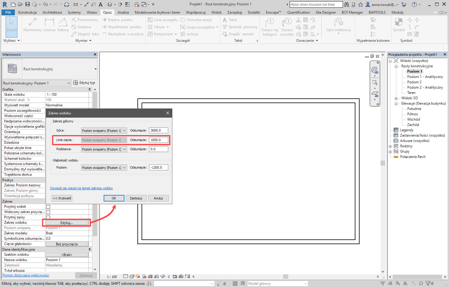 Istnieje możliwość ustawienia dla wyznaczonego obszaru widoku rzutu innych ustawień zakresu widoku, w tym wysokości cięcia, niż generalna wysokość cięcia ustawiona w okienku Zakres widoku. Służy do tego narzędzie